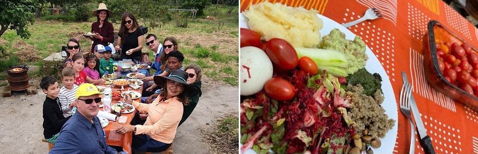 Al medio día almorzamos todos juntos la comida campesina, con los ricos alimentos orgánicos de la finca (comida vegetariana). Y después el almuerzo, hacemos una pequeña caminata hasta el lago y los hospedajes de la finca.