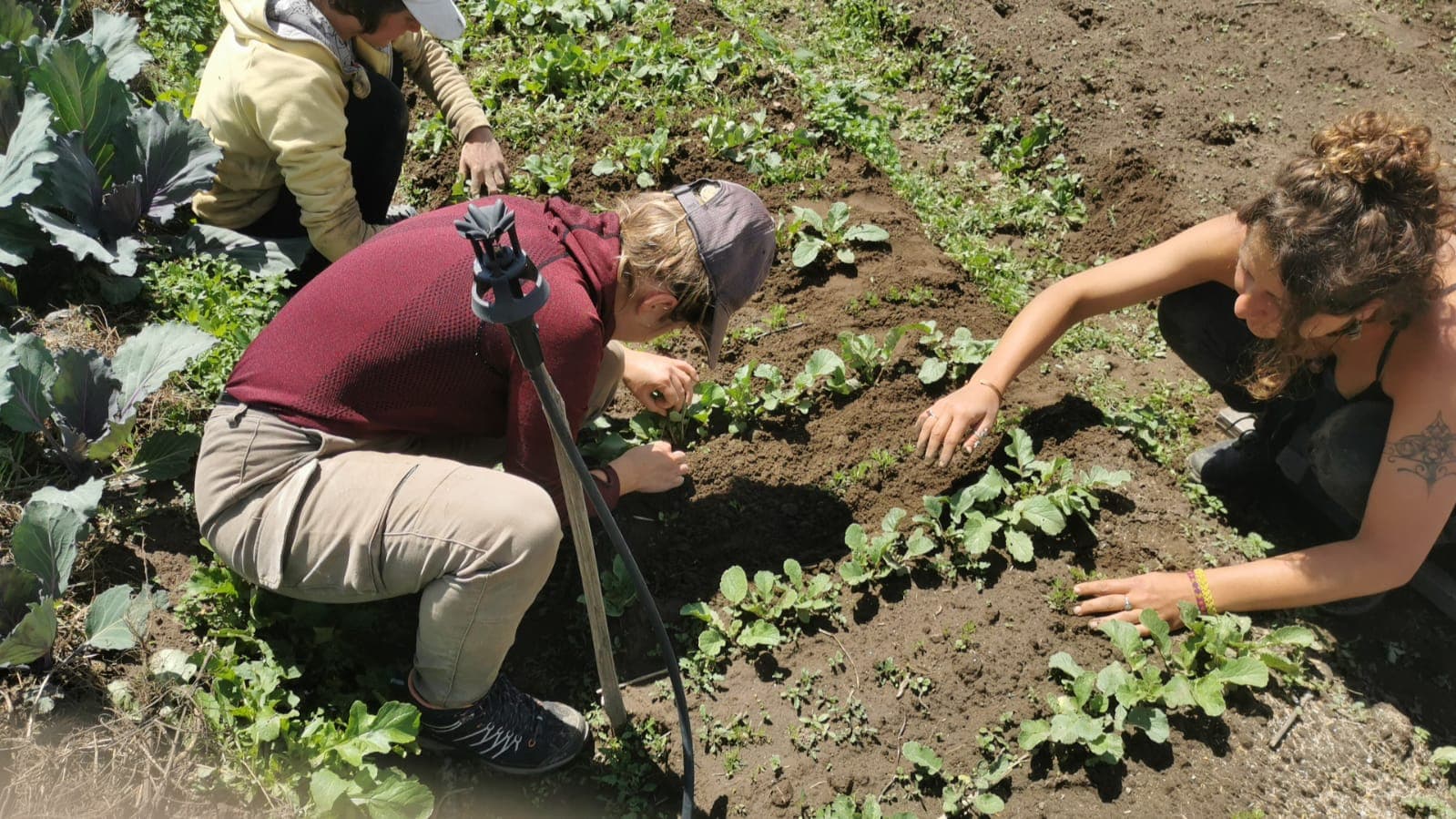 Trabajamos en el campo de las 8 de la mañana a las 12 del mediodia. Deshierbando, sembrando, cosechando, abonando, etc. Mucho trabajo de deshierba porque trabajamos en orgánico y la hierba crece. Podemos trabajar bajo lluvia o bajo sol fuerte. Siempre con hidratación.