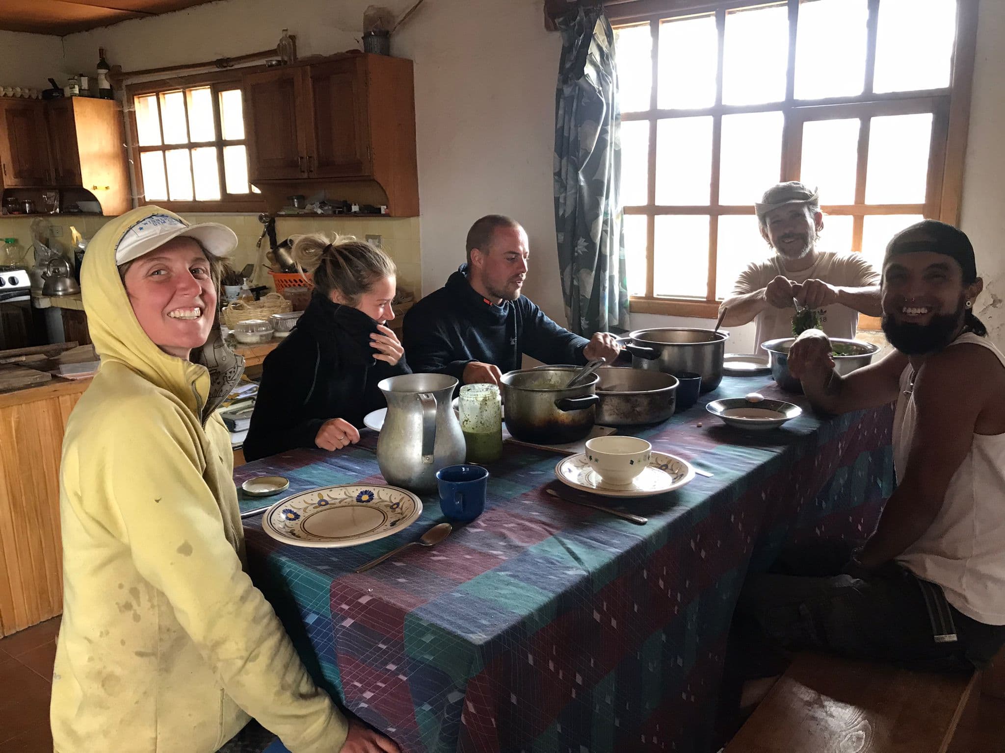 A las 8am nos encontramos en la finca para empezar los labores en el campo. A las 12pm preparamos el almuerzo y los quesos. A la 1pm almorzamos juntos: sopas, granos, verduras fritas, pizzas, aveces pasteles, cookies. Después dejamos la cocina bien limpia (lavar vajilla, secar vajilla, barrer la cocina, lavar placas).