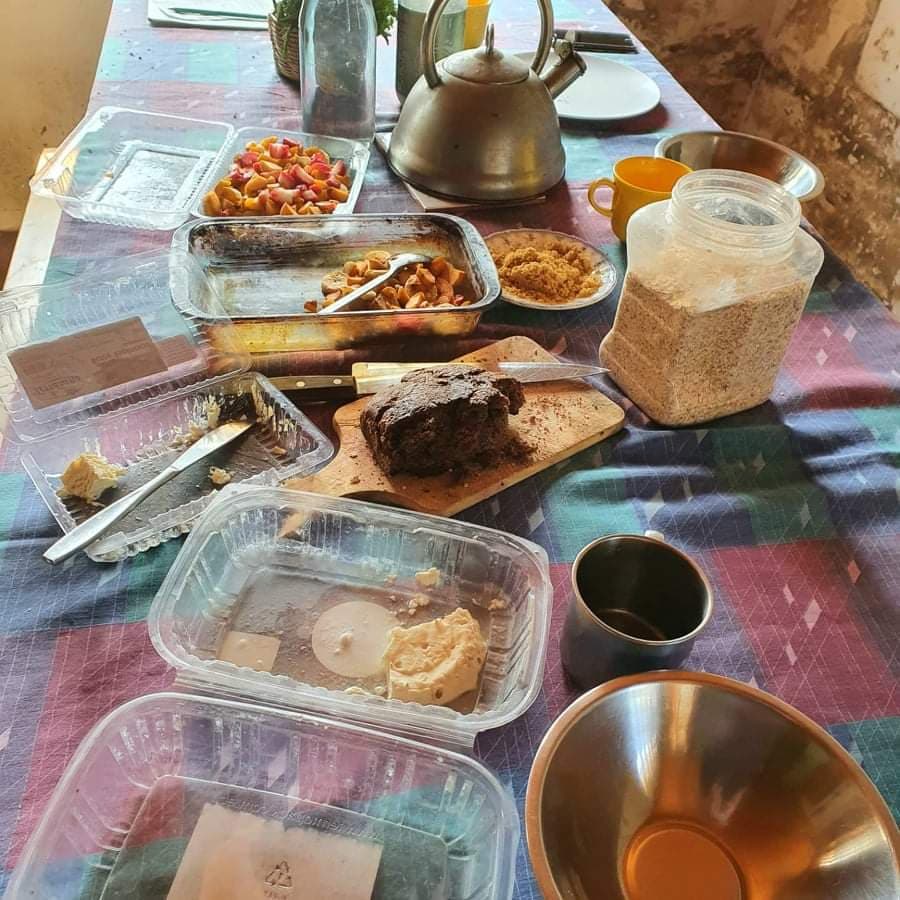 Para la cena, se llevan lo que queda del almuerzo para que calienten en su casa al lado del reservorio de la finca, a 7 minutos a pie de nuestra casa.